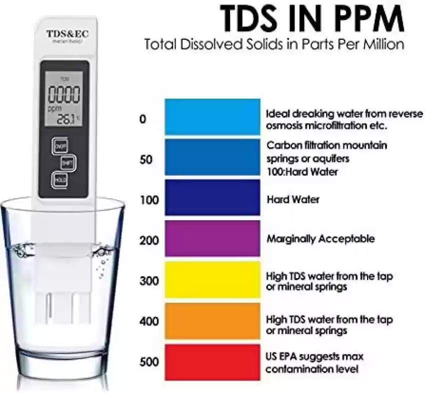 TDS określa ilość rozpuszczonych minerałów w wodzie i wyrażany jest w ppm.